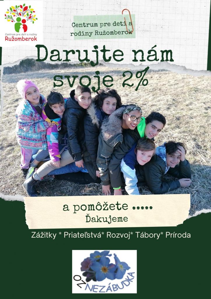 Získané finančné prostriedky využívame predovšetkým na rozvojové a zážitkové aktivity, tábory, výlety, kultúrne a športové podujatia a s nimi spojené nové dobrodružstvá, zážitky a priateľstvá. Vašími dvomi percentami darujete deťom z Centra pre deti a rodiny Ružomberok radosť a umožníte im plnohodnotné využitie voľného času či prázdnin.